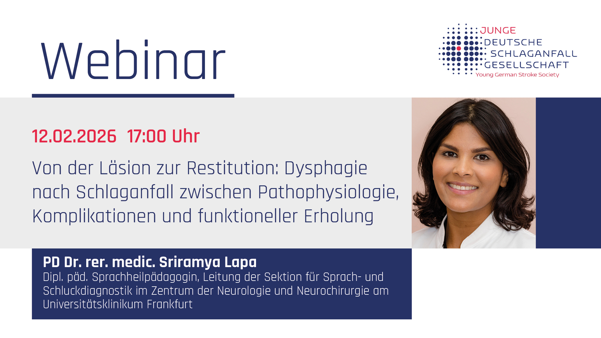 Am Donnerstag, den 12. Februar spricht PD Dr. Sriramya Lapa, Sprachheilpädagogin am Universitätsklinikum in Frankfurt über Dysphagien nach Schlaganfall. Das Webinar ist ein kleiner Vorgeschmack auf die Stroke Unit Winter School im Februar…